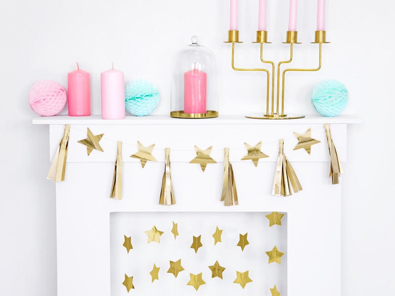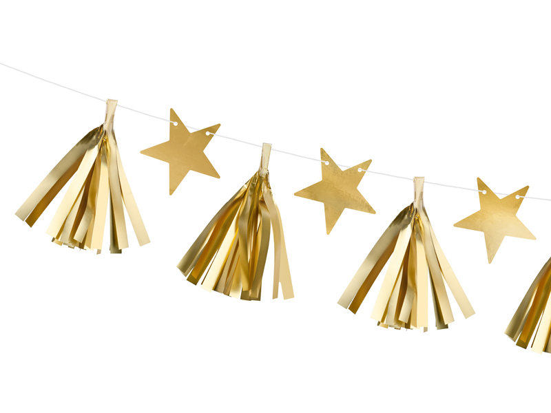 Imbunatateste orice decor de sarbatoare cu aceasta orbitoare ghirlanda cu stele si franjuri aurii. De la nunti si aniversari, zile de nastere, petreceri pentru micile staruri sau cu tematica spatiu cosmic, aceasta ghirlanda atrage toate privirile. Dispunand de 9 franjuri, 8 stele si 200 cm de ata alba, acest produs poate fi realizat in forma dorita